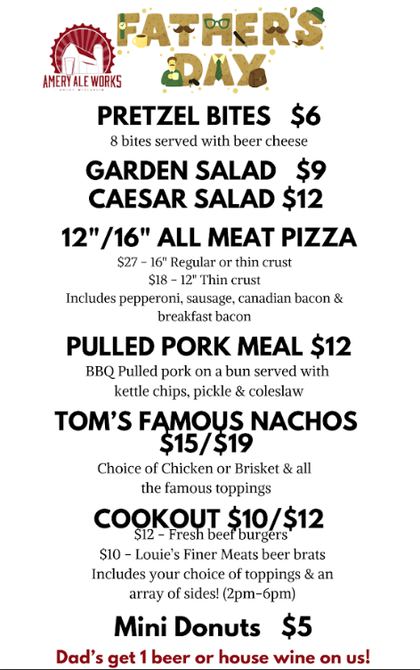 Celebrate dad this year at Amery Ale Works. The patio, a tasty meal & lots of good beer will be available for purchase. Not only that we’ve got live music scheduled! How can you go wrong?